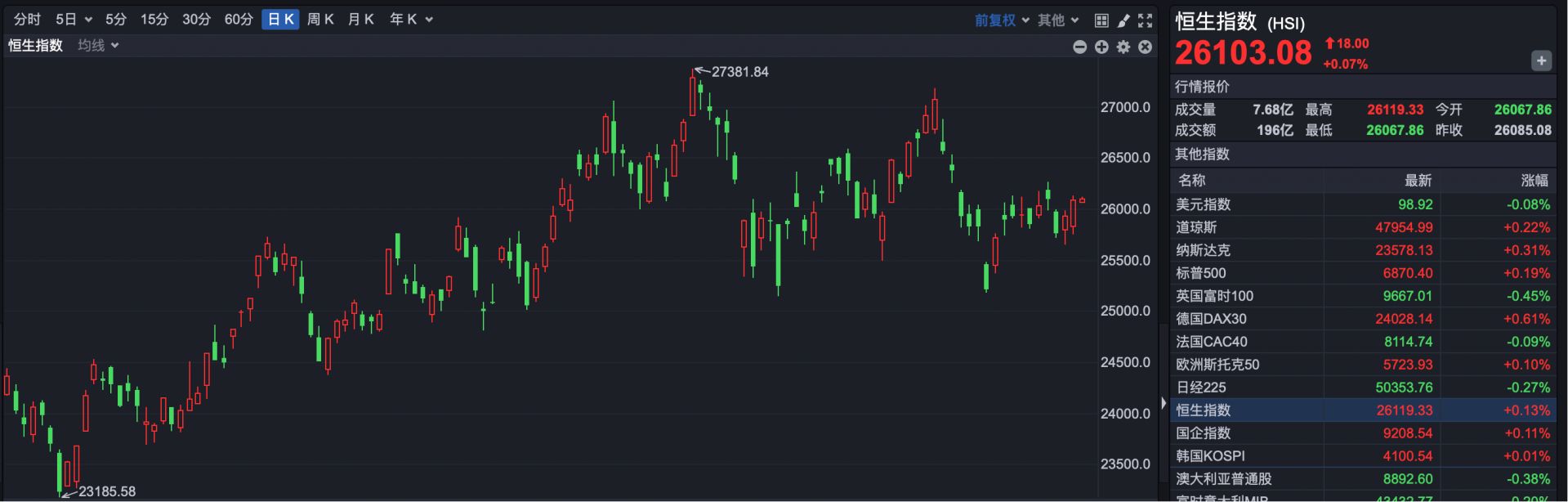截至发稿,恒生指数报26103.08点,上涨18点,涨幅0.07%。
