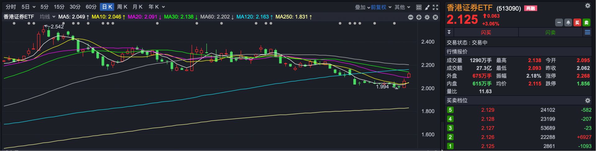 今日早盘表现来看,宏业期货(HK03678)大涨超8%,国泰海通(HK02611)、华泰证券(HK06886)涨超5%,中信证券、招商证券、国联民生涨超4%,其余内资券商股涨幅在2%~4%区间。ETF方面,香港证券ETF早盘涨超3%。