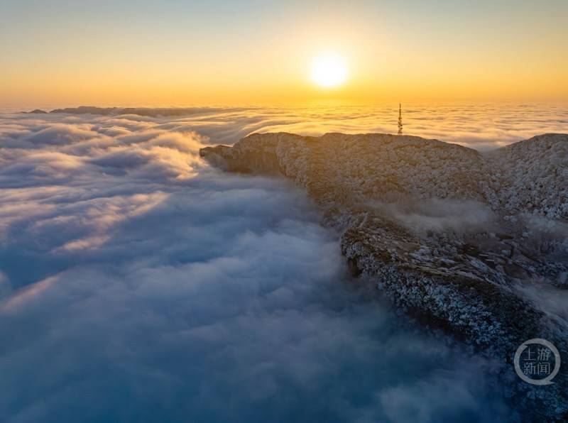 1月24日,重庆市南川区金佛山迎来一幅壮丽胜景,日出、云海与雪景同框亮相,吸引众多游客前来观赏。