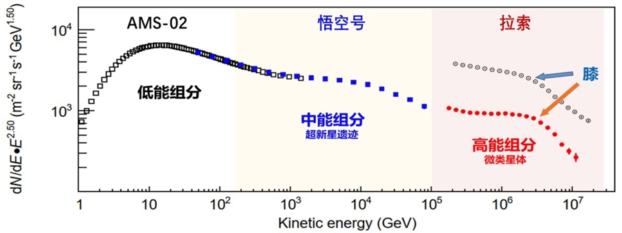 由此,近70年的“膝”结构谜团也得以解开:“拉索”的新结果与阿尔法磁谱仪2(AMS-02)测得的宇宙线低能组分、“悟空”号测得的中能组分一起,揭示了银河系内存在多种类的宇宙线加速器——它们都有各自独特的加速能力和能量范围,而“膝”的产生正是它们各自加速极限的表现。