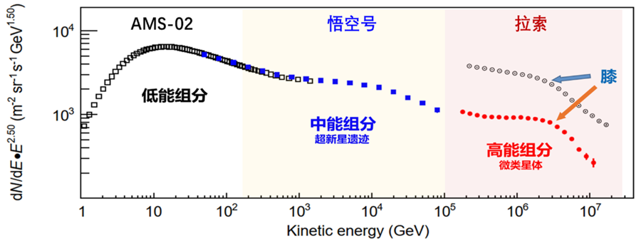 这一突破性的测量揭示了完全超出预期的能谱结构,清晰展现出一个新的“高能组分”。这一结果与阿尔法磁谱仪(安装在国际空间站的高能粒子物理探测器,由诺奖得主丁肇中主导设计建造)测得的低能组分、我国“悟空号”暗物质粒子探测卫星测得的中能组分,一起揭示了银河系内存在多种类的加速源,每一类有各自独特的加速能力和能量范围,而“膝”正是产生高能组分的源的加速极限表现(见下图)。